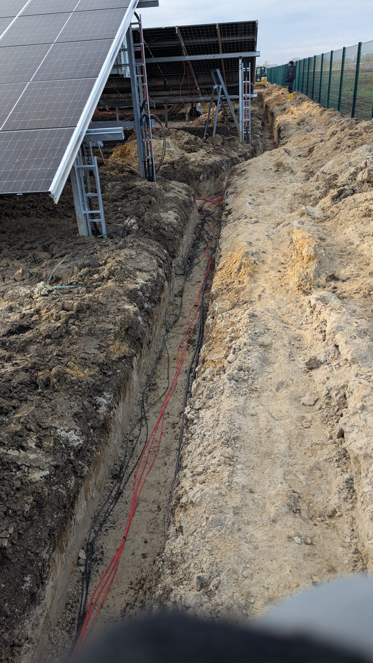 Trotz Schnee, Matsch und winterlicher Temperaturen gehen die Arbeiten an unserem Bürgersolarpark Möhler weiter voran. Inzwischen sind alle PV-Module montiert, sämtliche 15 Wechselrichter installiert und große Teile der DC-Verkabelung abgeschlossen. Aktuell werden die Wechselstromkabel von den Wechselrichtern zu den beiden Trafostationen in vorbereiteten Gräben verlegt. Die Abnahme der Unterkonstruktion ist bereits erfolgreich erfolgt.